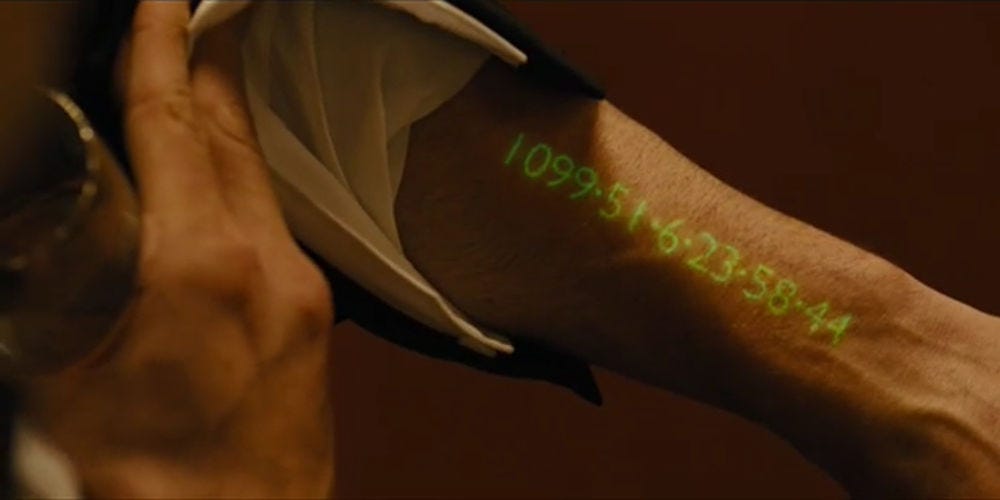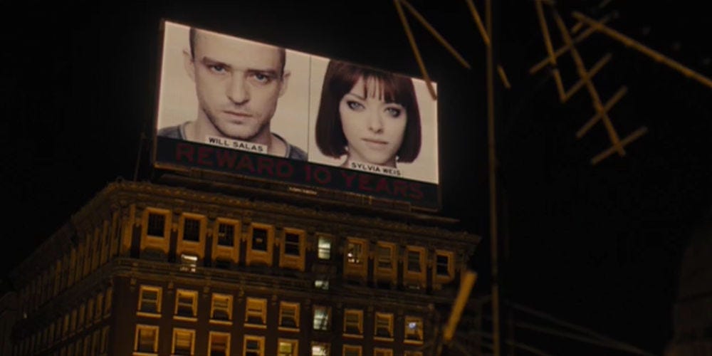In “In Time,” age and life are electronically controlled. Everyone stops aging naturally at 25, and their continued existence is regulated by some kind of electronic implant that stores their time. A wealthy person could have thousands of years stored in the bank. A poor person might barely earn enough minutes to survive from one day to the next. When your digital counter reaches zero, poof - you instantly drop dead.